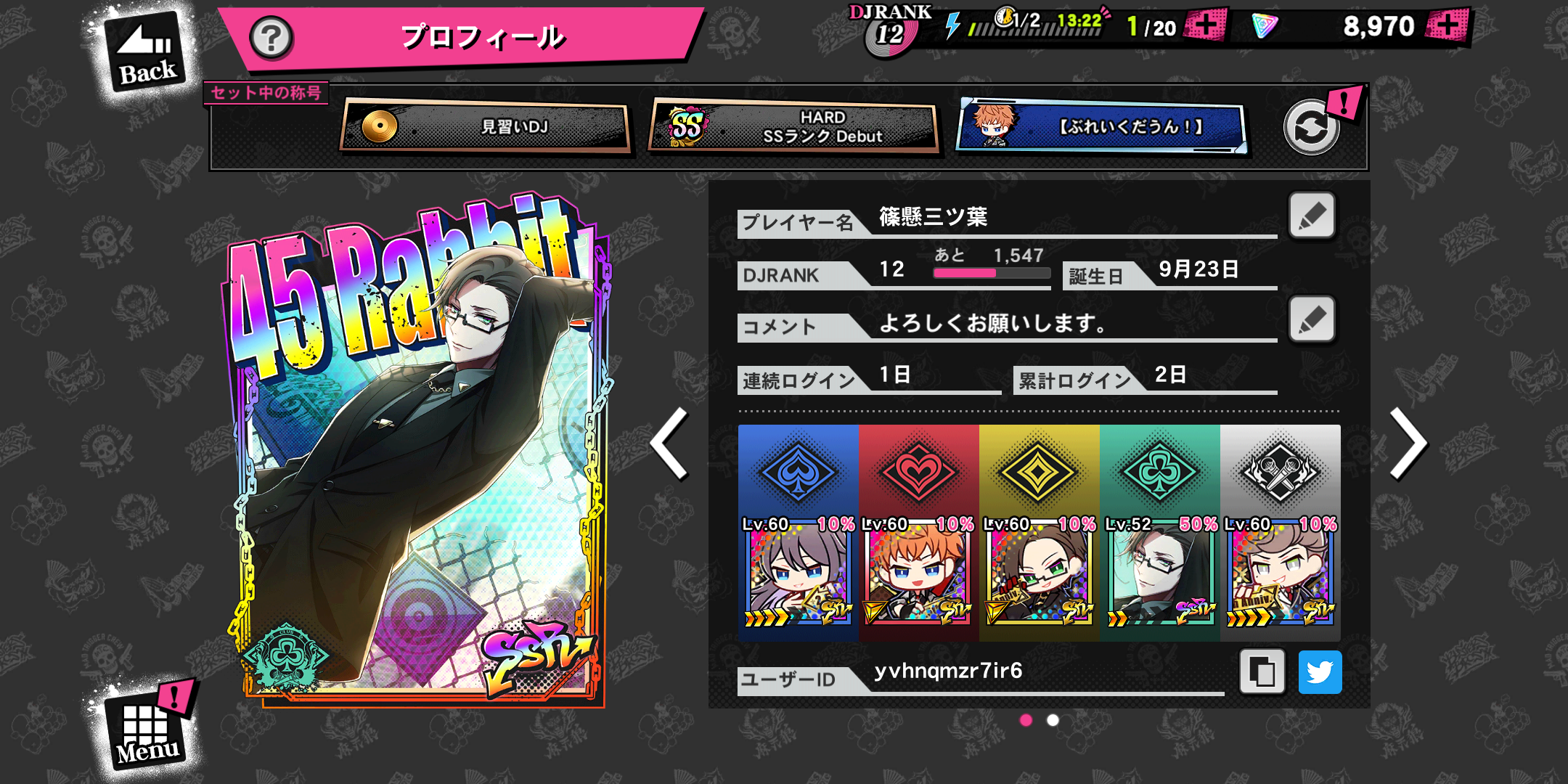 見た目で以前から気になってたのは理鶯さんだけど、よく知らないから特にこだわりないし同じ箱だからいいやとチュートリアル10連SSRは最初に出た銃兎さんのまま進めて、育成周りのシステムよくわからん言いながらテキトー編成で音ゲーやってる。#[ヒプマイARB]