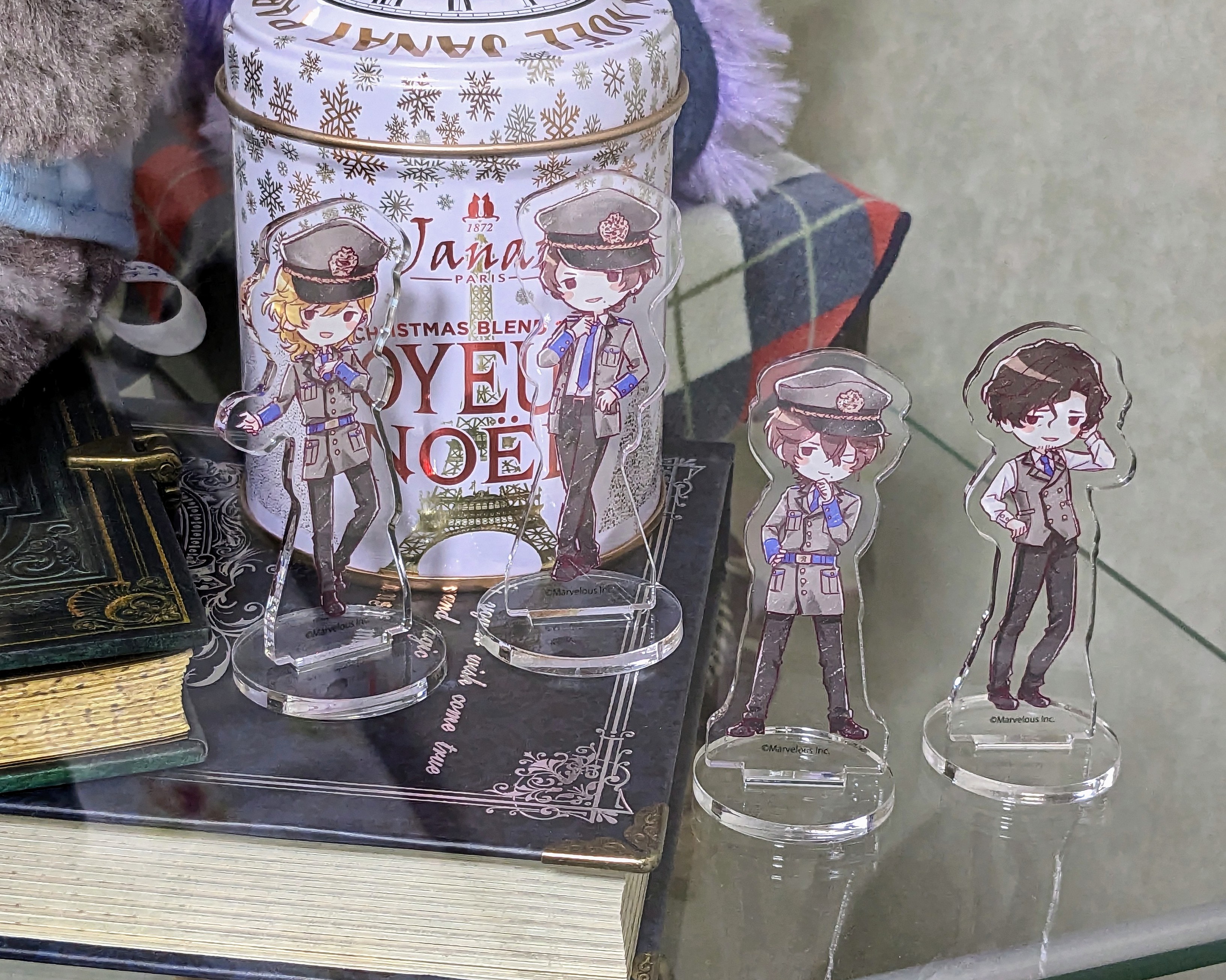 ガラス棚2段目のディスプレイに置いてたカフェコラボのやつと入れ替えただけだけどなんかいい感じだから暫くこのままでいいや。ジャンナッツのノエル缶が背景として丁度良すぎる件(僕らパリジャンですという顔してる)。