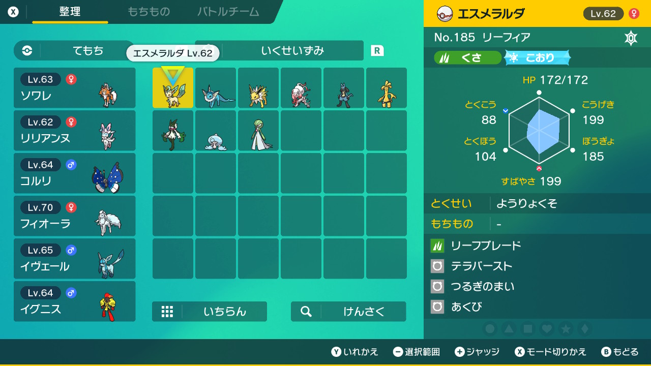 ブイズ厨の管理人がニャオハ相棒で冒険を始めて上から順に好きなポケモンだけで手持ちを固めたらマジでこんなメンツになりかねない。