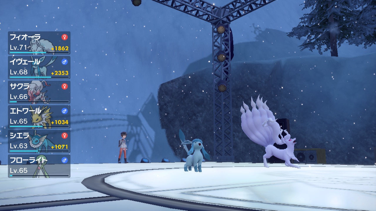 グレイシアとローテーションしつつ、誰も落とされずに突破。アロキュウで雪降らすまでもなく最初から雪降ってるから氷タイプの耐久がすごいことになるね。